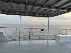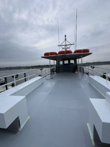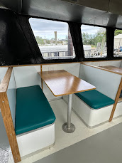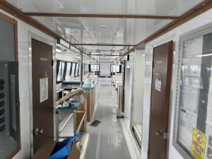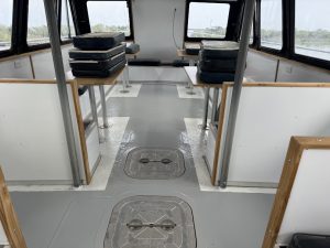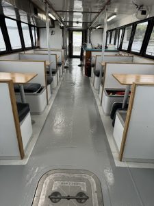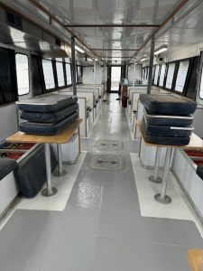 Where can we begin? It has been a long winter. The men have been hard at work on a total renewal of the interior and upper deck of Miss Chris. Scraping, Sanding, Priming, Painting, Paneling, Cutting, Fitting, Bolting, Drilling Tapping…..The list goes on, and on, and on. There has been work done every week for months. The result? An all new cabin space appropriate for longer trips and private parties, and an upper deck with space for your next party.