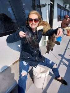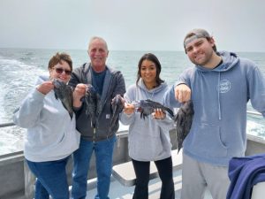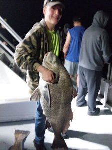 The night trips have seen fish up to 75 lbs on fresh whole clams. One Angler landed a fish on 25lb spinning tackle, but after boating the fish, the leader snapped at the swivel. Instead of luck, we recommend heavier tackle, 40-50lb line to take on these behemoths of the bay. These monsters will give you a work out and while the per angler limit is three, most are finished after one is caught due to their heft and runs with the tide!