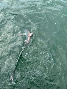 Thresher shark brought to boat and released alive and unharmed